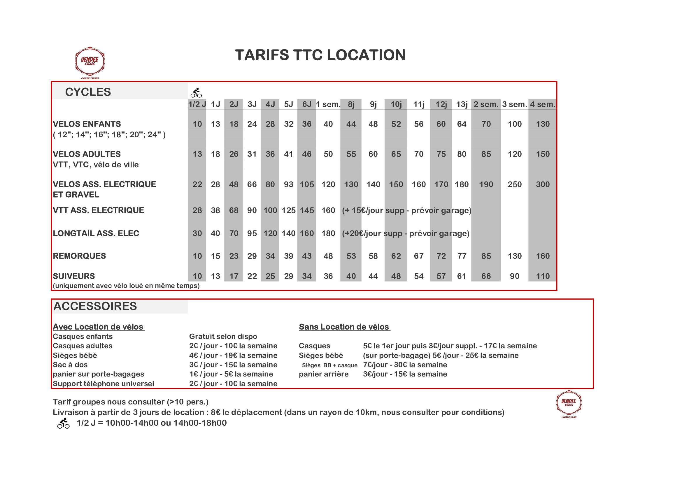 Livraison possible dès 3 jours de location (limité en haute saison) sur Longeville-sur-Mer, Les Conches, Angles, St Vincent-sur-Jard, Avrillé, St Hilaire la Forêt, Le Bernard : 8€ par déplacement (donc dépôt + collecte = 16€), quel que soit le nombre de vélos…